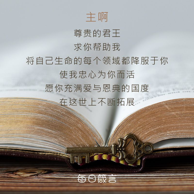 主啊,尊贵的君王,求你帮助我将自己生命的每个领域,都降服于你。使我忠心为你而活,愿你充满爱与恩典的国度在这世上不断拓展。奉耶稣之名祷告,阿们。