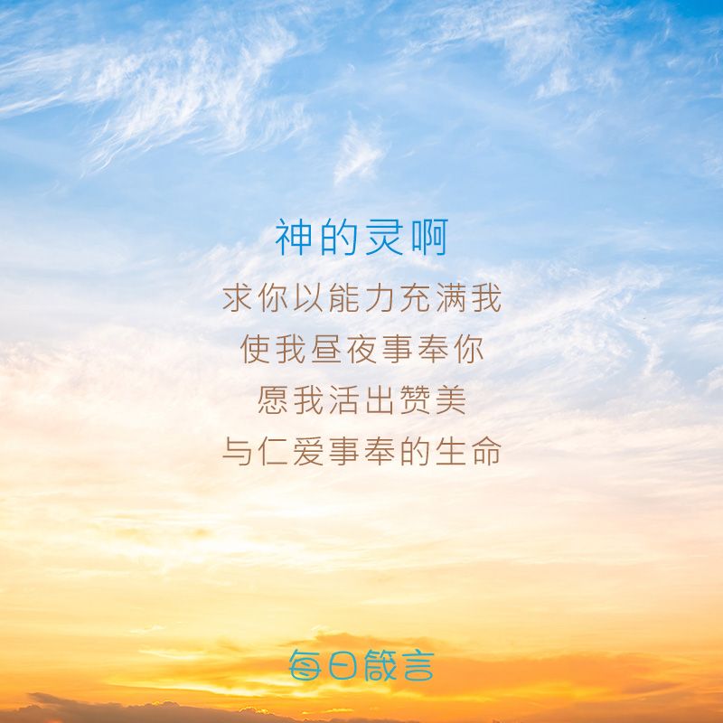 神的灵啊,求你以能力充满我,使我昼夜事奉你。愿我活出赞美与仁爱事奉的生命。阿们。