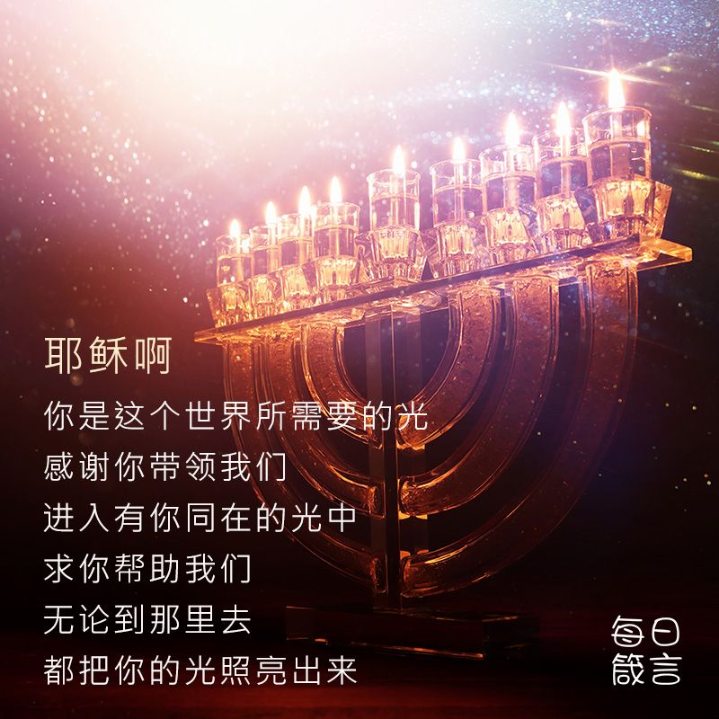 耶稣啊,祢是这个世界所需要的光!感谢祢带领我们进入有祢同在的光中,求祢帮助我们,无论到那里去,都把祢的光照亮出来。奉祢的名求,阿们。