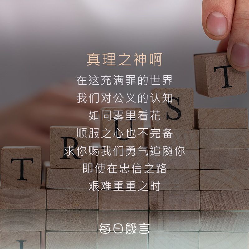真理之神啊,在这充满罪的世界,我们对公义的认知如同雾里看花,顺服之心也不完备。求你赐我们勇气追随你,即使在忠信之路艰难重重之时。阿们。