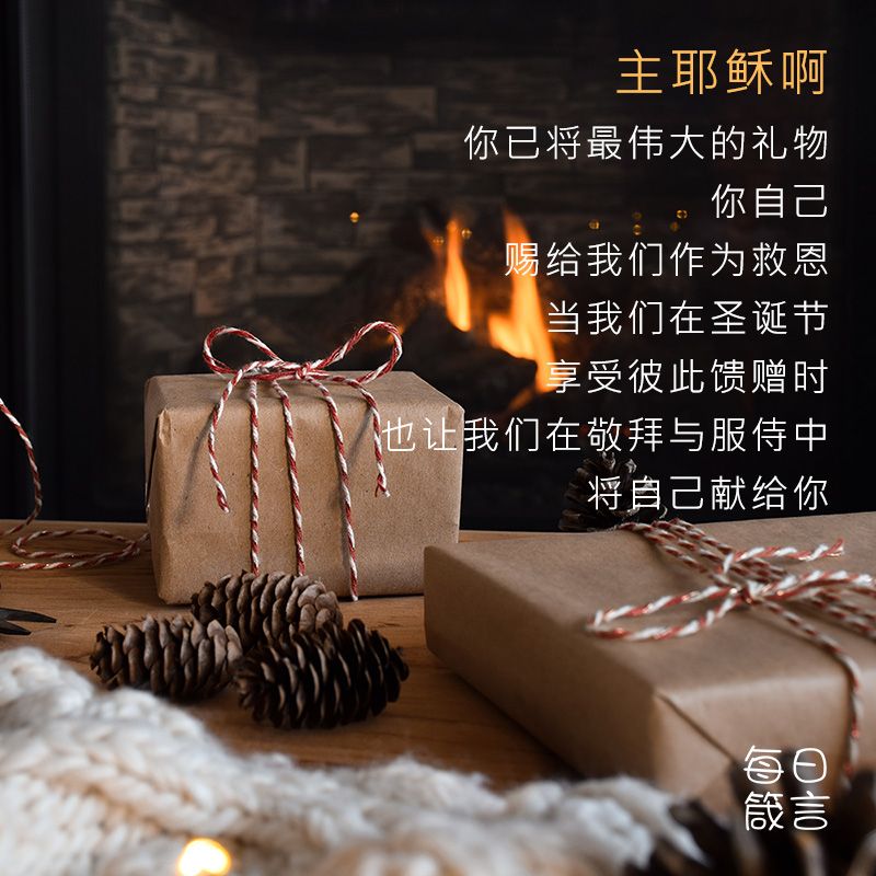 主耶稣啊,你已将最伟大的礼物—你自己—赐给我们作为救恩。当我们在圣诞节享受彼此馈赠时,也让我们在敬拜与服侍中将自己献给你。奉你的名求,阿们。