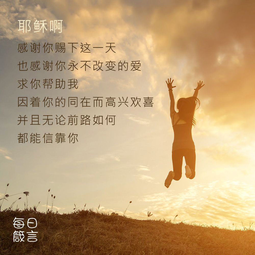 耶稣啊,感谢你赐下这一天,也感谢你永不改变的爱。求你帮助我,因着你的同在而高兴欢喜,并且无论前路如何,都能信靠你。阿们。