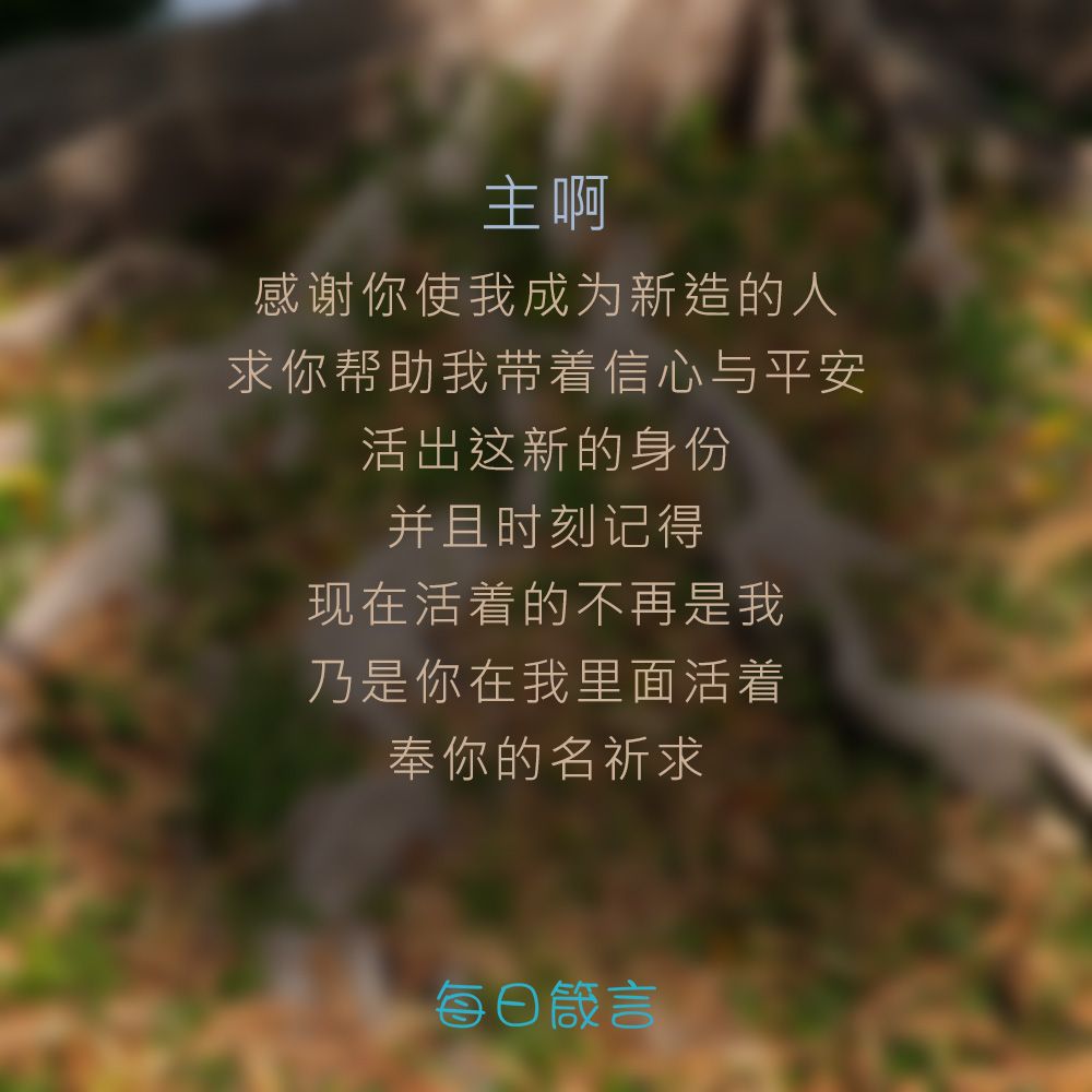 主啊,感谢你使我成为新造的人。求你帮助我带着信心与平安,活出这新的身份,并且时刻记得:现在活着的不再是我,乃是你在我里面活着。奉你的名祈求,阿们。