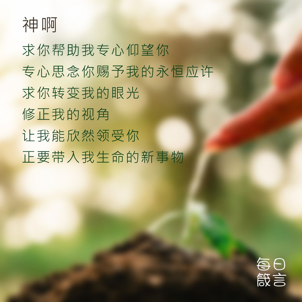 神啊,求你帮助我专心仰望你,专心思念你赐予我的永恒应许。求你转变我的眼光,修正我的视角,让我能欣然领受你正要带入我生命的新事物。阿们。