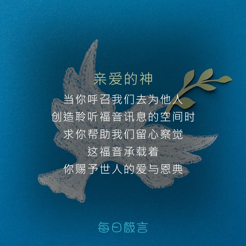 亲爱的神,当你呼召我们去为他人创造聆听福音讯息的空间时,求你帮助我们留心察觉。这福音承载着你赐予世人的爱与恩典。阿们。
