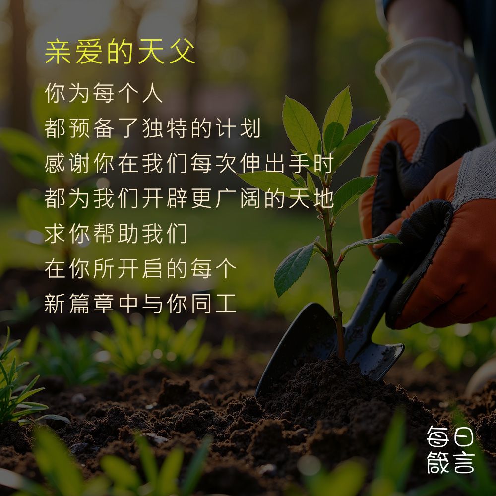 亲爱的天父,你为每个人都预备了独特的计划。感谢你在我们每次伸出手时,都为我们开辟更广阔的天地。求你帮助我们在你所开启的每个新篇章中与你同工。阿们。