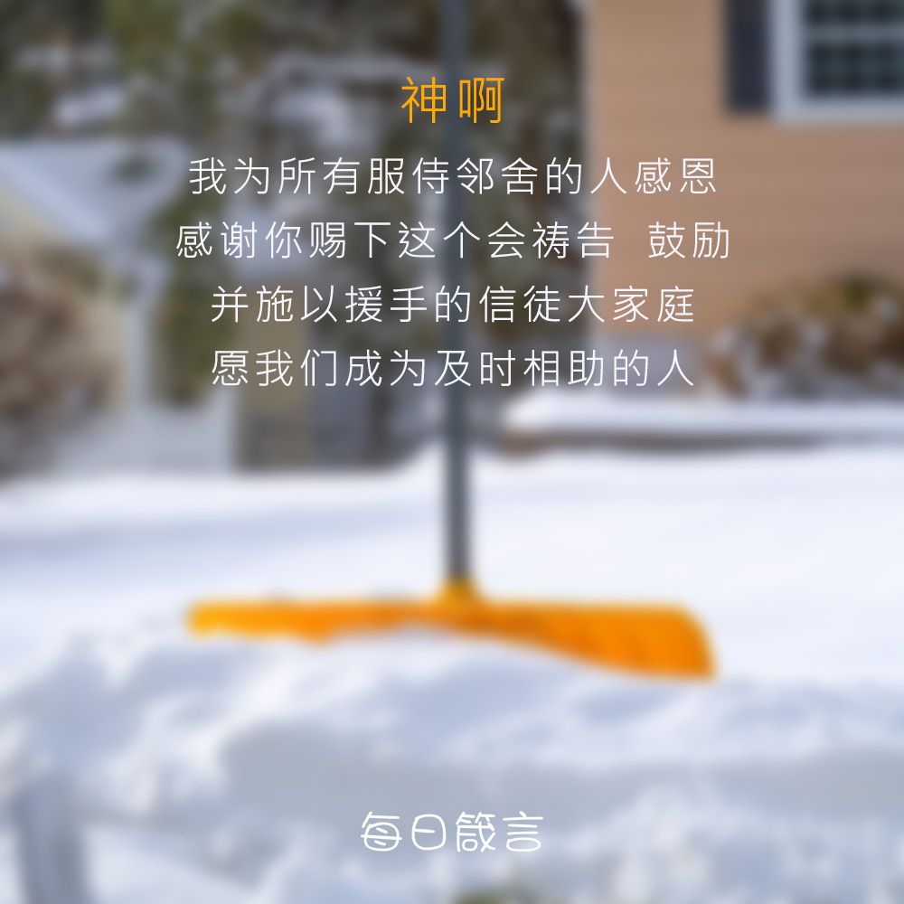 神啊,我为所有服侍邻舍的人感恩。感谢你赐下这个会祷告、鼓励,并施以援手的信徒大家庭。愿我们成为及时相助的人。阿们。
