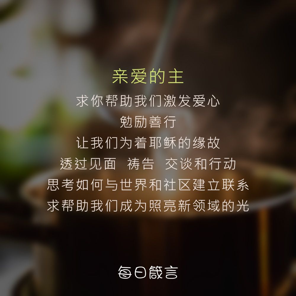 亲爱的主,求你帮助我们“激发爱心,勉励善行”。让我们为着耶稣的缘故,透过见面、祷告、交谈和行动,思考如何与世界和社区建立联系。求帮助我们成为照亮新领域的光。阿们。