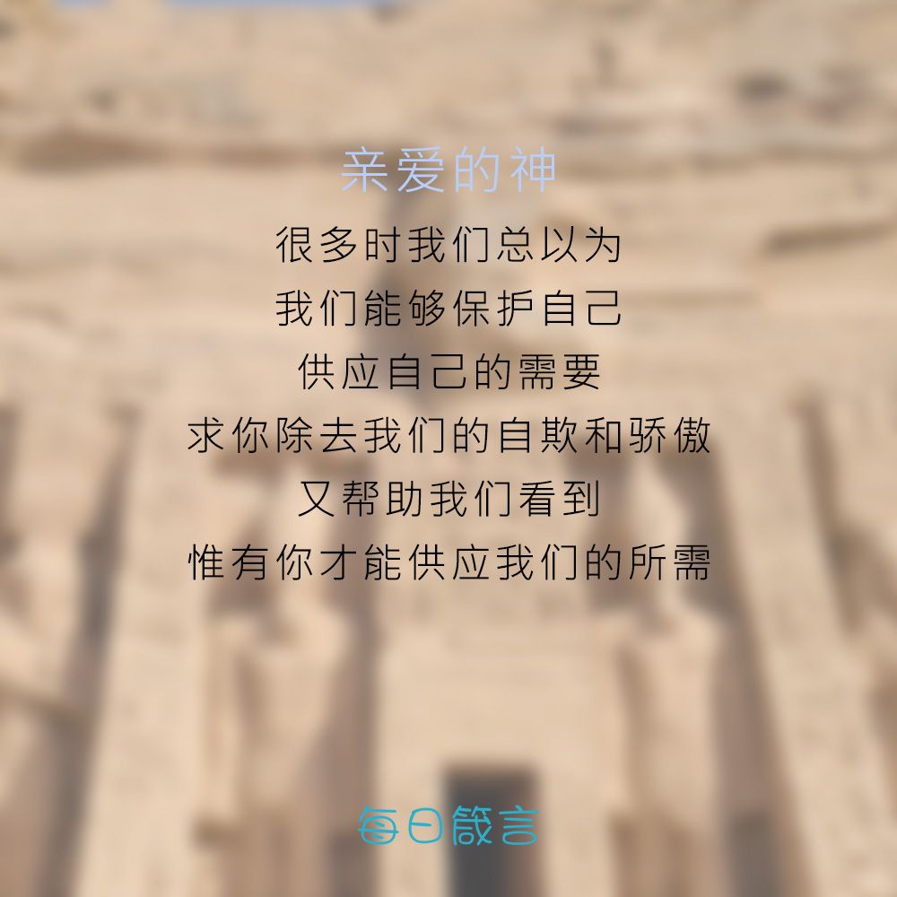 亲爱的神,很多时我们总以为我们能够保护自己,供应自己的需要,求你除去我们的自欺和骄傲,又帮助我们看到,惟有你才能供应我们的所需。阿们。