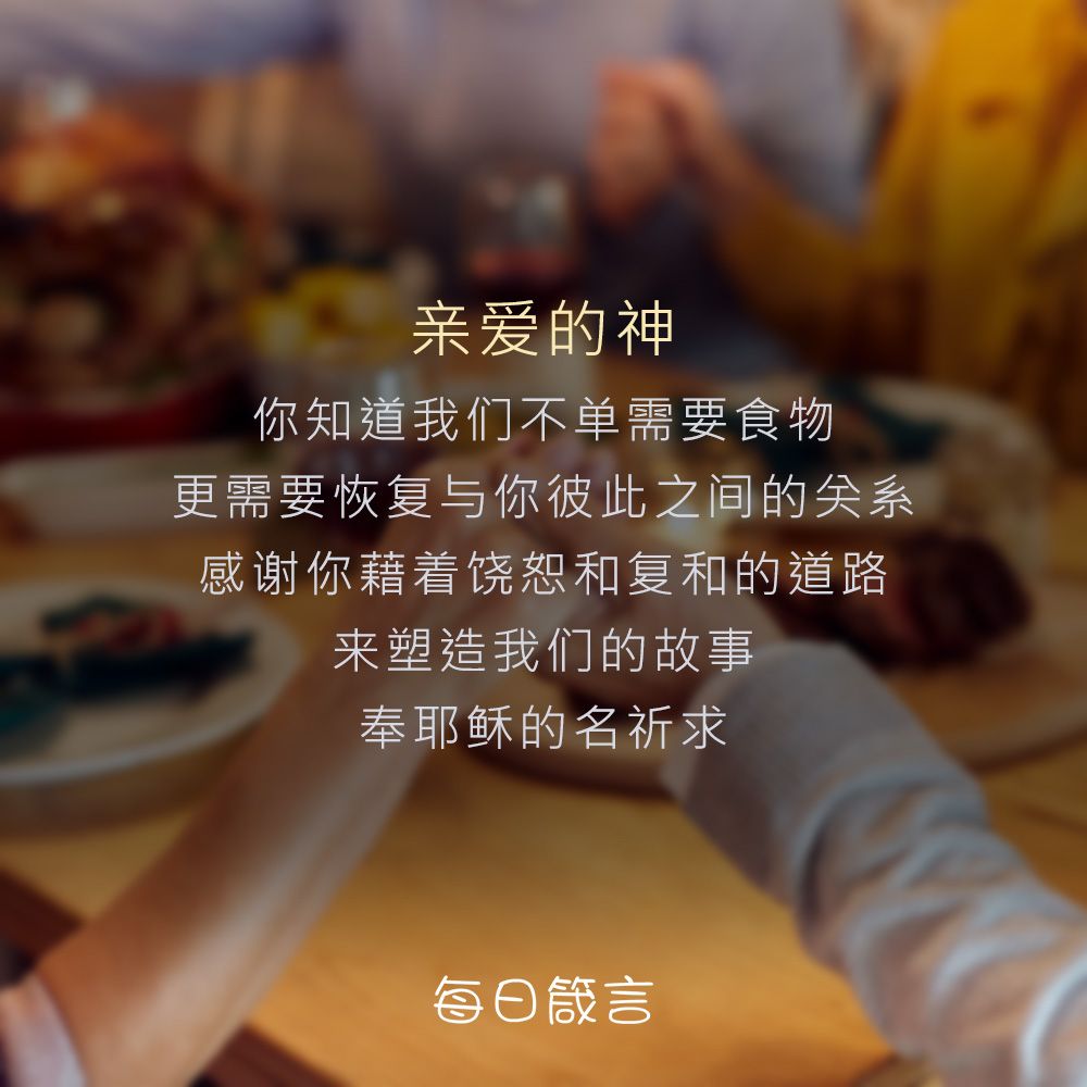 亲爱的神,你知道我们不单需要食物,更需要恢复与你彼此之间的关系。感谢你藉着饶恕和复和的道路,来塑造我们的故事。奉耶稣的名祈求,阿们。