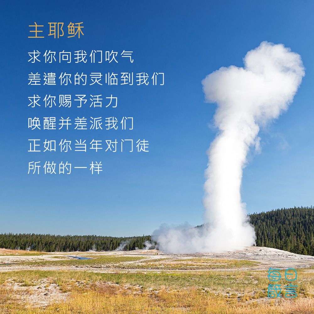 你听说过美国黄石国家公园里的“老忠实”(Old Faithful)间歇泉吗?它的水柱能喷射到130英尺(40米)的高空!我们也可以把耶稣的气息想像成类似间歇泉的样子—一个生命的喷泉。
