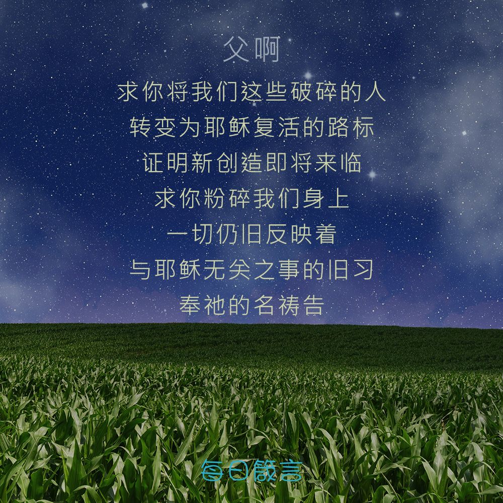 父啊,求你将我们这些破碎的人,转变为耶稣复活的路标,证明新创造即将来临。求你粉碎我们身上一切仍旧反映着与耶稣无关之事的旧习。奉祂的名祷告。阿们。