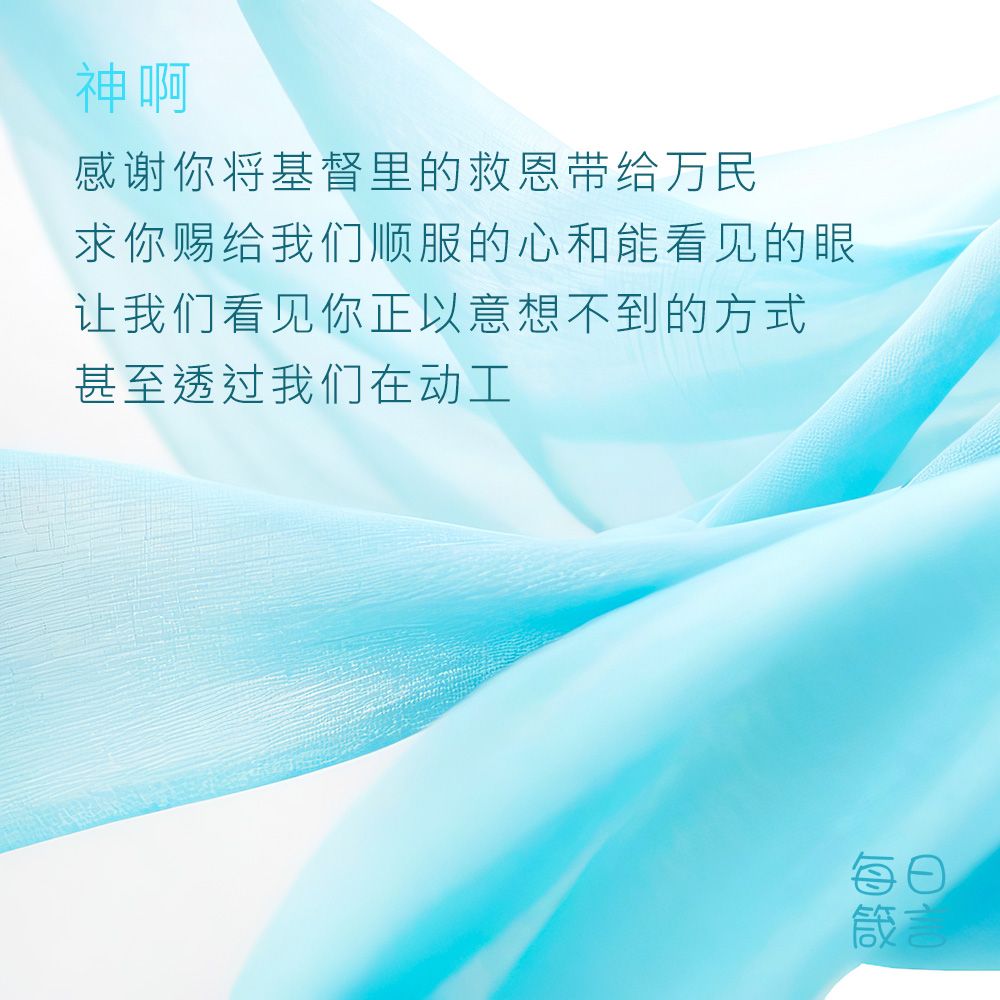 神啊,感谢你将基督里的救恩带给万民!求你赐给我们顺服的心和能看见的眼,让我们看见你正以意想不到的方式,甚至透过我们在动工。阿们。