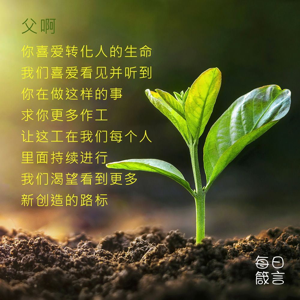 父啊,你喜爱转化人的生命。我们喜爱看见并听到,你在做这样的事。求你更多作工,让这工在我们每个人里面持续进行。我们渴望看到更多新创造的路标。阿们。
