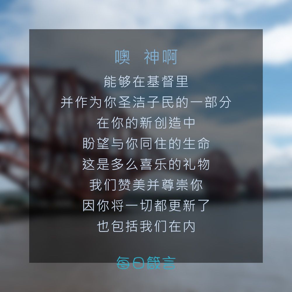噢,神啊,能够“在基督里”,并作为你圣洁子民的一部分,在你的新创造中,盼望与你同住的生命,这是多么喜乐的礼物。我们赞美并尊崇你,因你将一切都更新了,也包括我们在内。阿们。